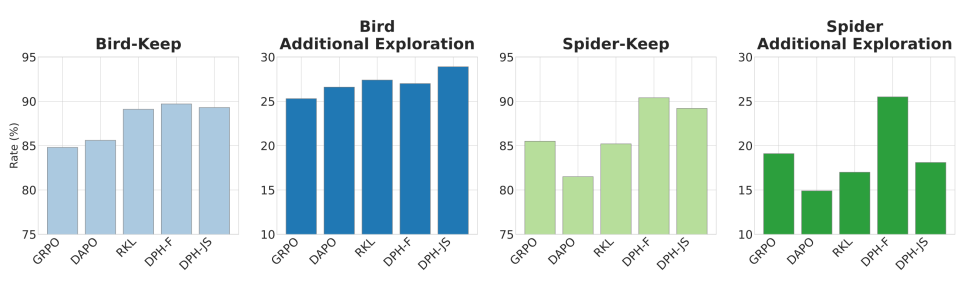 由此可见,DPH-RL通过对强化学习组件的功能解耦,实现了保留与探索的显式平衡。它证明了在通过 RL 提升模型能力上限的同时,稳固已有的知识底座是取得最终胜出的关键。