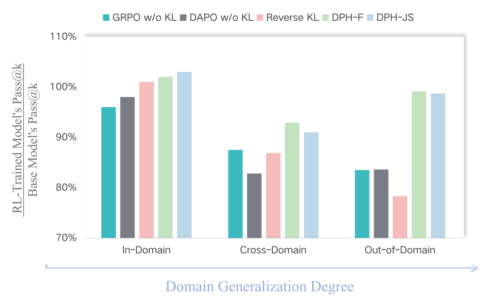 Pass@k分数显著高于其他所有RL方法,最接近Base Model的原始水平;Pass@16分数较DAPO高出9.0%;这表明,通过保留解决方案的多样性,DPH-RL能够更有效地防止灾难性遗忘,从而在面对新领域问题时保持更强的泛化能力。