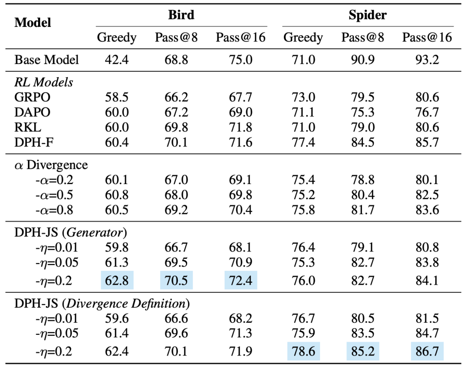 Greedy(相当于Pass@1)表现,但其Pass@8和Pass@16分数均显著低于Base Model,证实了多样性坍塌的存在;Pass@k出现下降;Greedy分数最高,其Pass@8分数也超越了Base Model。其中,DPH-JS的Pass@8分数较GRPO高出4.3%。在更大的k设置下,DPH-RL更接近base model,缓解了Pass@k的崩塌。我们将SQL任务上的Spider数据集视为cross-domain,将数学数据集视为out-of-domain。可以看到,所有仅在SQL数据集Bird上训练得到的RL模型,在分布发生偏移时都会出现不同程度的性能下降。