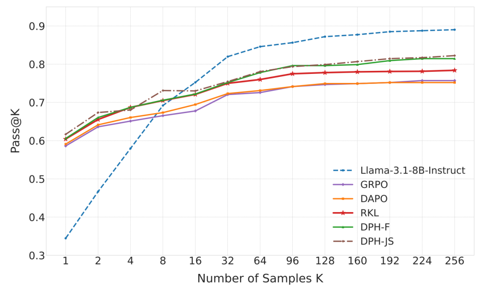 实验表明,DPH-RL不仅能缓解Pass@k下降问题,还可同时提升Pass@1,并在跨域任务上展现出更优的稳定性与泛化能力。更重要的是,这一结果启示我们:在RL后训练时代,保住多样性与提高奖励同等重要。