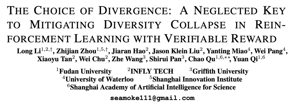 针对这一问题,复旦大学、无限光年、上海科学智能研究院(下称上智院)、上海创智学院的联合研究团队聚焦于长期被忽视的KL散度项,从divergence选择的角度破解这一难题。相关研究成果已被ICLR2026接收。