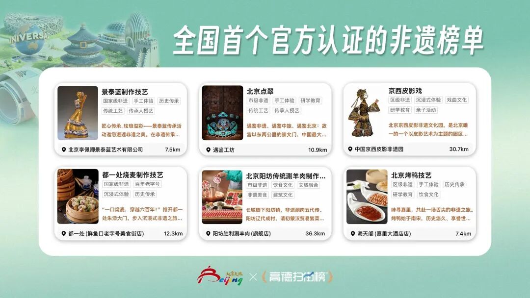 4月13日,北京市文化和旅游局联合市商务局、高德地图发布“畅游北京”扫街榜及文旅地图,首期推出八大特色榜单,涵盖非遗体验、胡同美食、名人故居、生态观鸟等多个领域,入选文旅消费目的地超过300个。
