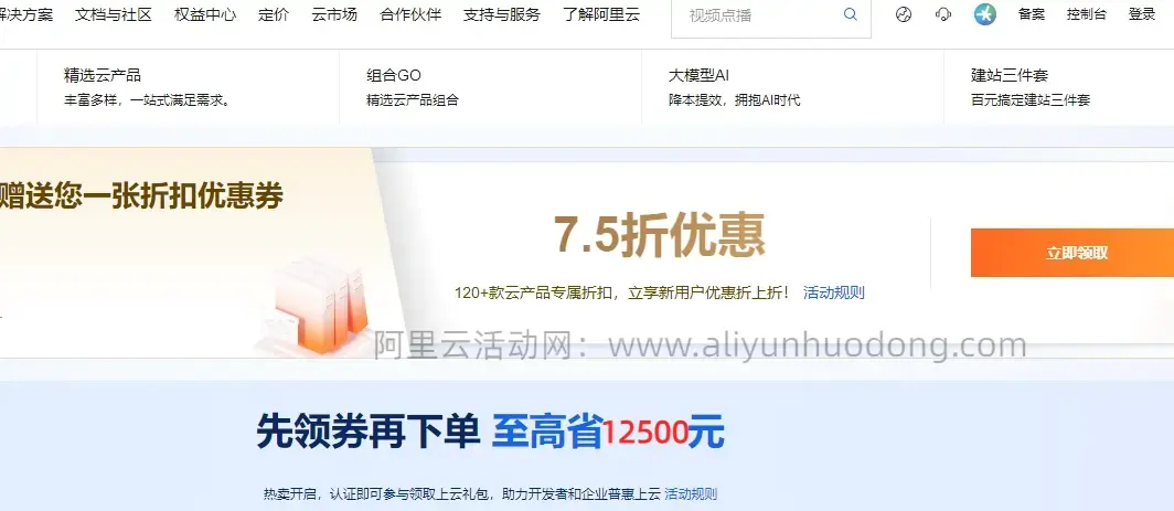 购买之前建议先领取阿里云赠送的7.5折云产品通用优惠券,此优惠券仅通过官方云小站平台进行发布。用户在官方云小站领取该优惠券后,再购买云产品时,可以在活动价格的基础上,额外享受7.5折的优惠,实现活动价格的折上折,优惠力度最高可达12500元。举例说明:经济型e实例4核8G配置,活动价格是1595.11元/1年,领了7.5折优惠券,可以减免398.78元,券后价格只要1196.33元/1年。再比如计算型c9i实例8核16G5M带宽,活动价格6998.92元/1年,用券后能减免1749.73元,券后只要5249.19元/1年。小编推荐先领券再购买,价格会便宜很多。折扣优惠券领取地址:阿里云官方云小站平台