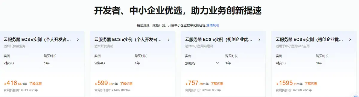 | 经济型e(ecs.e-c1m2.large) | 2核4G | 1M-5M | 40G ESSD Entry云盘 | 599.93元/1年/1M带宽 834.53元/1年/2M带宽 1089.53元/1年/3M带宽 1344.53元/1年/4M带宽 1640.33元/1年/5M带宽 |