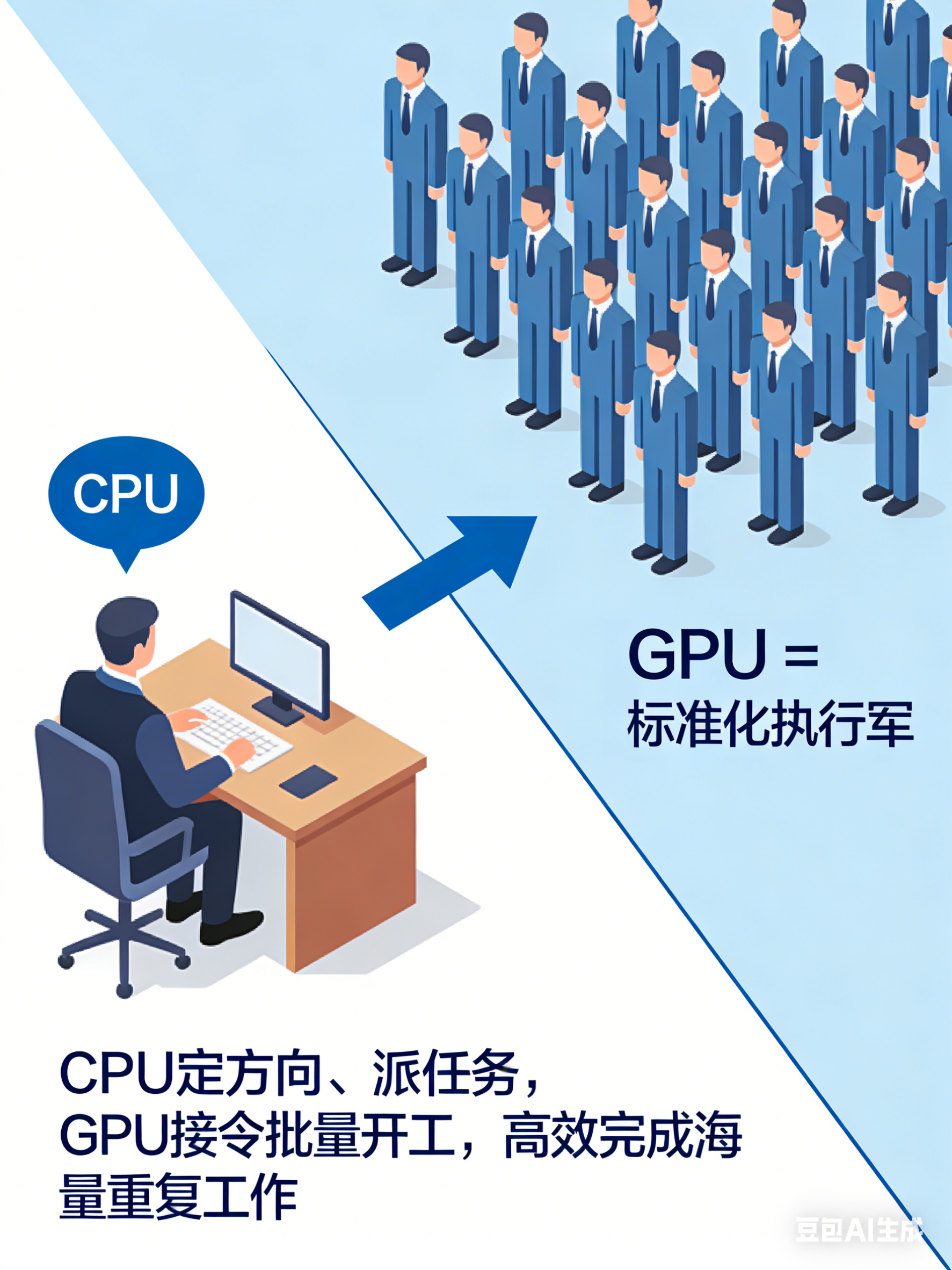 AI模型训练,就像集团要完成百万级快递分拣的超大项目。CPU(总经理)负责定方案、分批次、控流程,但具体到每一件快递的分拣、扫码、搬运,让总经理一个人干,耗时会无限拉长;而GPU这支千人铁军,每人同时干一个标准化动作,百万件快递很快就能处理完毕。这种海量并行计算的效率,当前没有任何硬件能替代。
