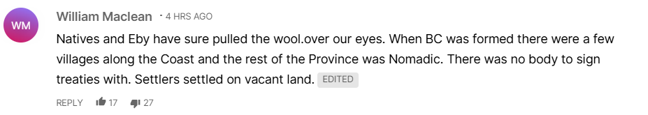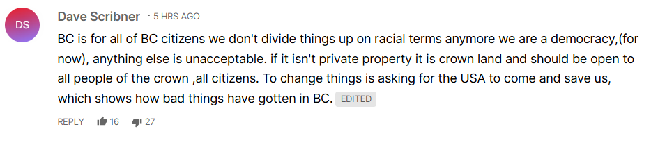卑诗省属于所有卑诗省公民,我们不再按种族划分事物,我们是一个民主社会(至少目前是),其他做法都是不可接受的。如果不是私人财产,那就是王室土地,应该向所有王室子民——也就是所有公民——开放。想要改变这一点,无异于在呼唤美国来拯救我们,这说明卑诗的情况已经糟糕到这个地步。