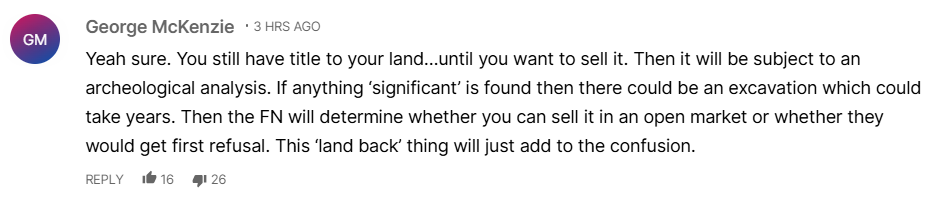 是啊,当然。你仍然拥有你的土地所有权……直到你想卖掉它的时候。那时,它将可能被进行考古分析。如果发现任何‘重要’的东西,就可能需要进行挖掘,可能会耗费数年时间。然后,原住民将决定你是否可以在公开市场上出售,或者他们是否有优先购买权。这个‘土地归还’的事情只会增加混乱。