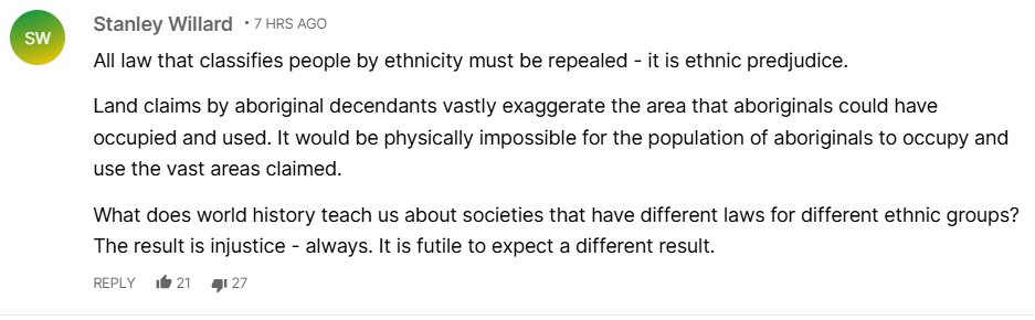 所有按族裔划分人的法律都必须废除——这是种族偏见。 原住民后裔的土地主张大大夸大了原住民可能居住和使用的区域。按照声称的范围,原住民的人口实际上不可能完全占据和使用这些广阔的土地。 世界历史教给我们什么?对不同族裔制定不同法律的社会,结果总是——不公正。期待不同结果是徒劳的。