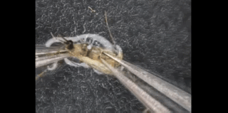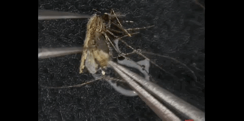 首先我们用两个镊子,分别夹住蚊子的头部和尾部,往两边一拽,它的肠道就被分离出来了。这个白色的就是蚊子的中肠。