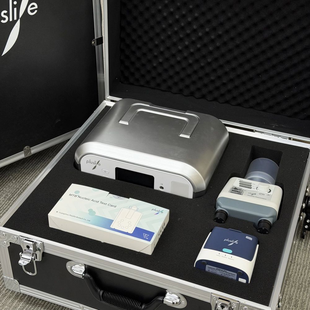 廖晓旺:大家好,其实我已经把结核病检测的「实验室」带到了现场。箱子里就是我们要展示的解决方案,里面有检测试剂卡、分子检测平台、移动电源。