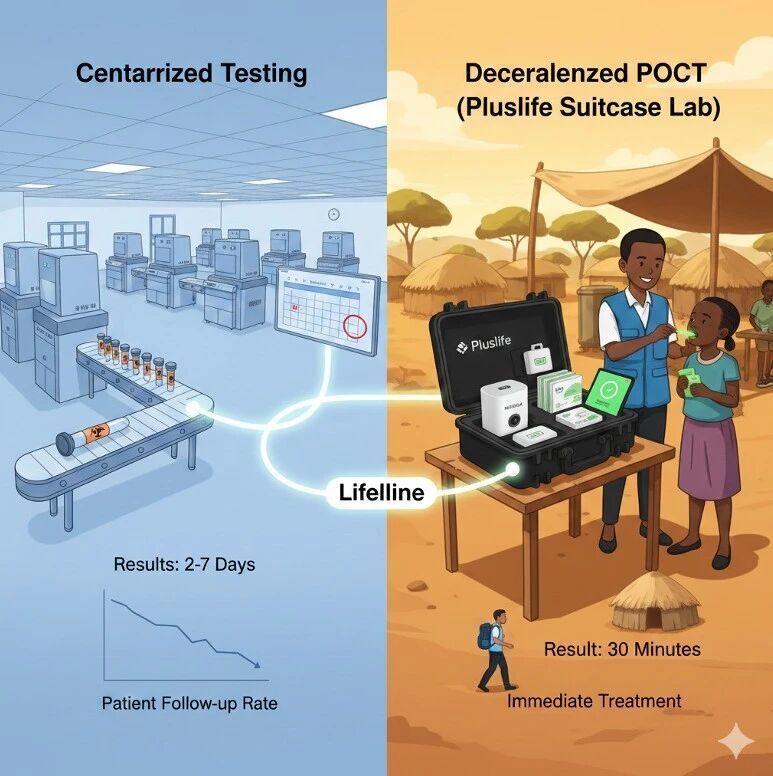 而去中心化是「实验室找人」,把实验室的能力下沉到第一现场。无论是非洲的村落还是印尼的海岛,在采样现场就能直接锁定病人。