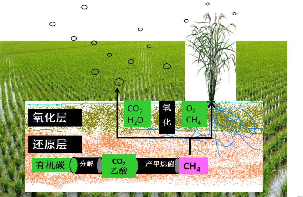 刘灶长:对的,常规水稻在淹水条件下,甲烷细菌特别活跃,能够把土壤当中的有机质降解形成甲烷,一方面通过植株的气孔排放到大气当中,另一方面直接通过土壤的水层排放到大气当中。夏天如果我们赤脚踩入稻田的话,看到冒泡咕噜咕噜出来的,那个就是土壤排出的甲烷。