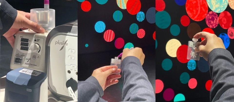 然后将这个试剂管放入预热好的混匀仪中,处理5分钟。接下来将处理好的样本注入这块芯片,拧紧、按压,快速摇匀,