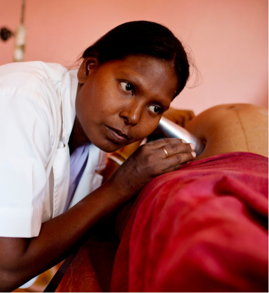而在偏远地区,设备、医生、基础设施这三样往往同时缺失。这张图就是非洲的医护人员仍然在用简易的听筒来确认胎心,可见相关设备的缺失是多么严重。