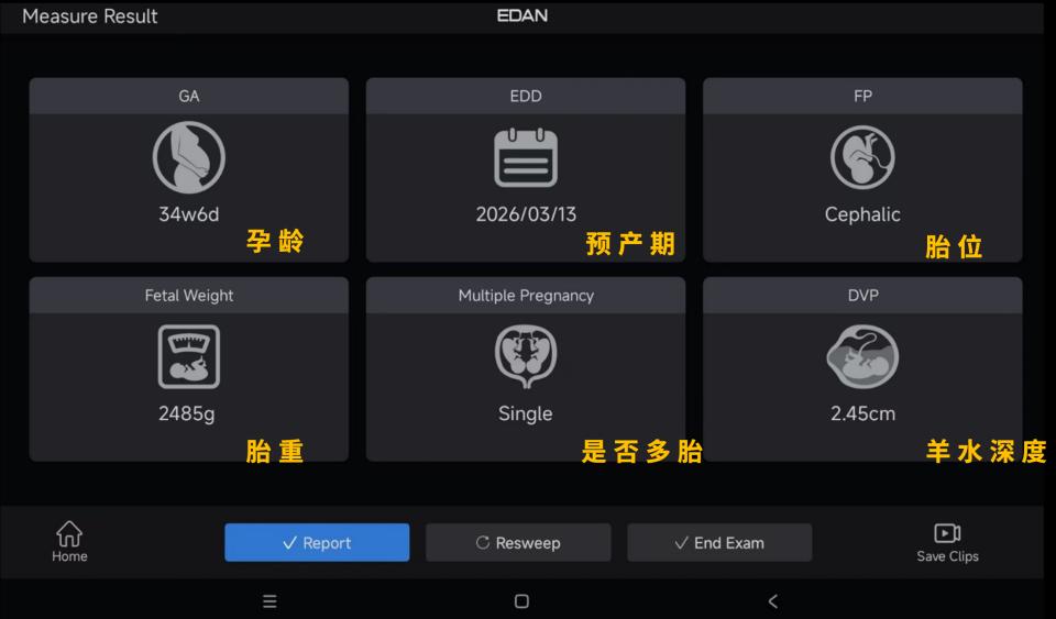 实际在应用中,我们输出的页面上包含六个核心指标:孕龄、胎重、胎位、羊水深度、是否多胎,以及推测的预产期。